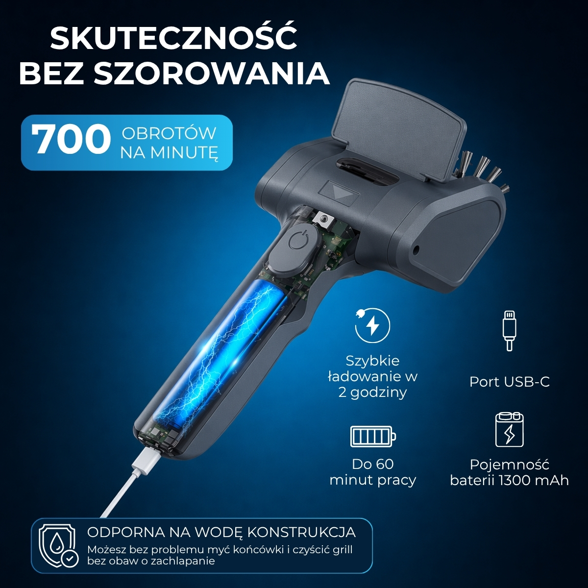 Posiada odporną na wodę obudowę – możesz również bez problemu myć końcówki i czyścić grill bez obaw o zachlapanie urządzenia.